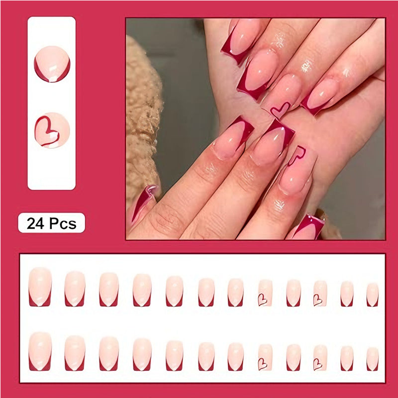 24 PCS Valentine's Day Press On Nails, French Tip Medium Square Wine Red Heart Fake Nails Natural Fit Gel Acrylic Nails, Glue On Nails False Nail Set